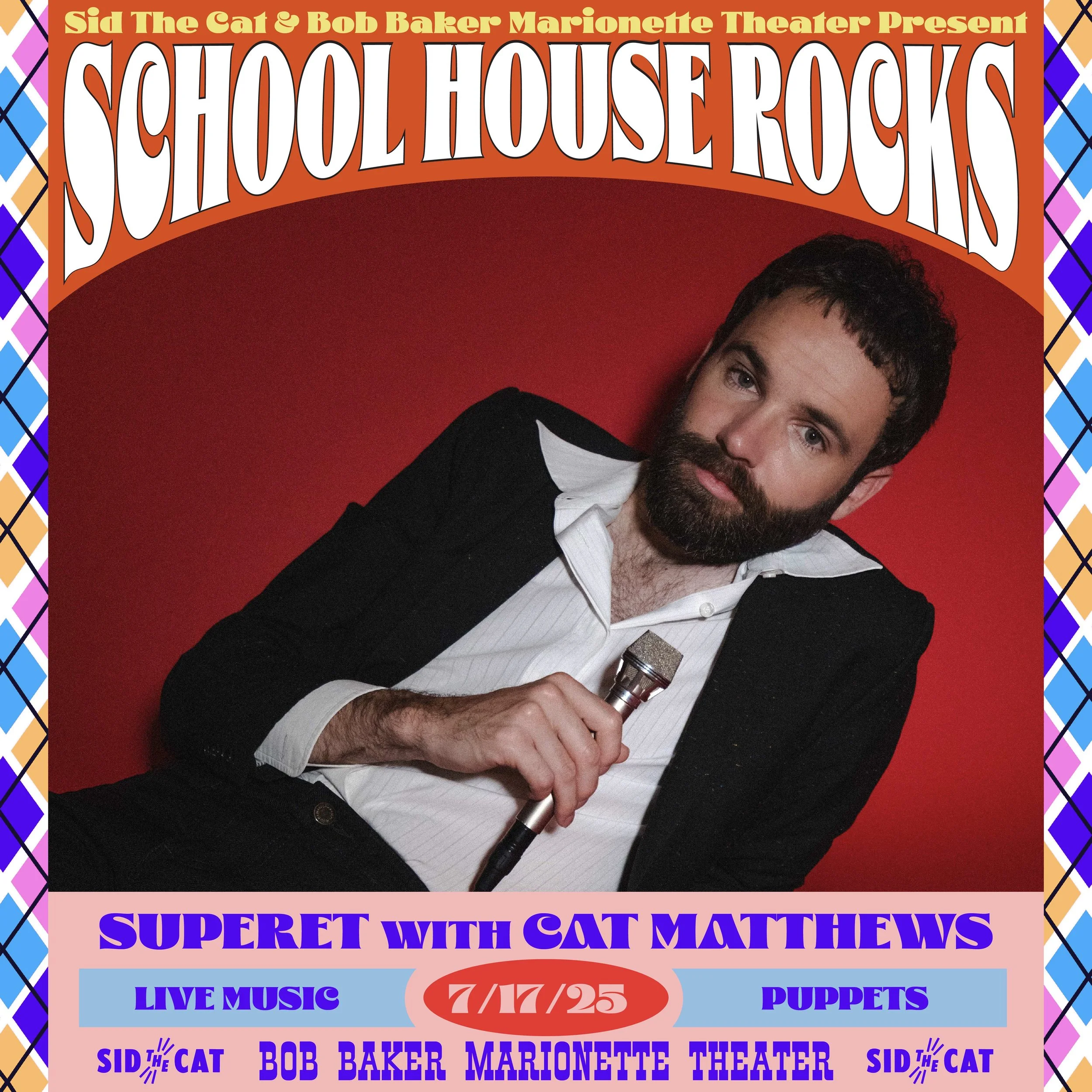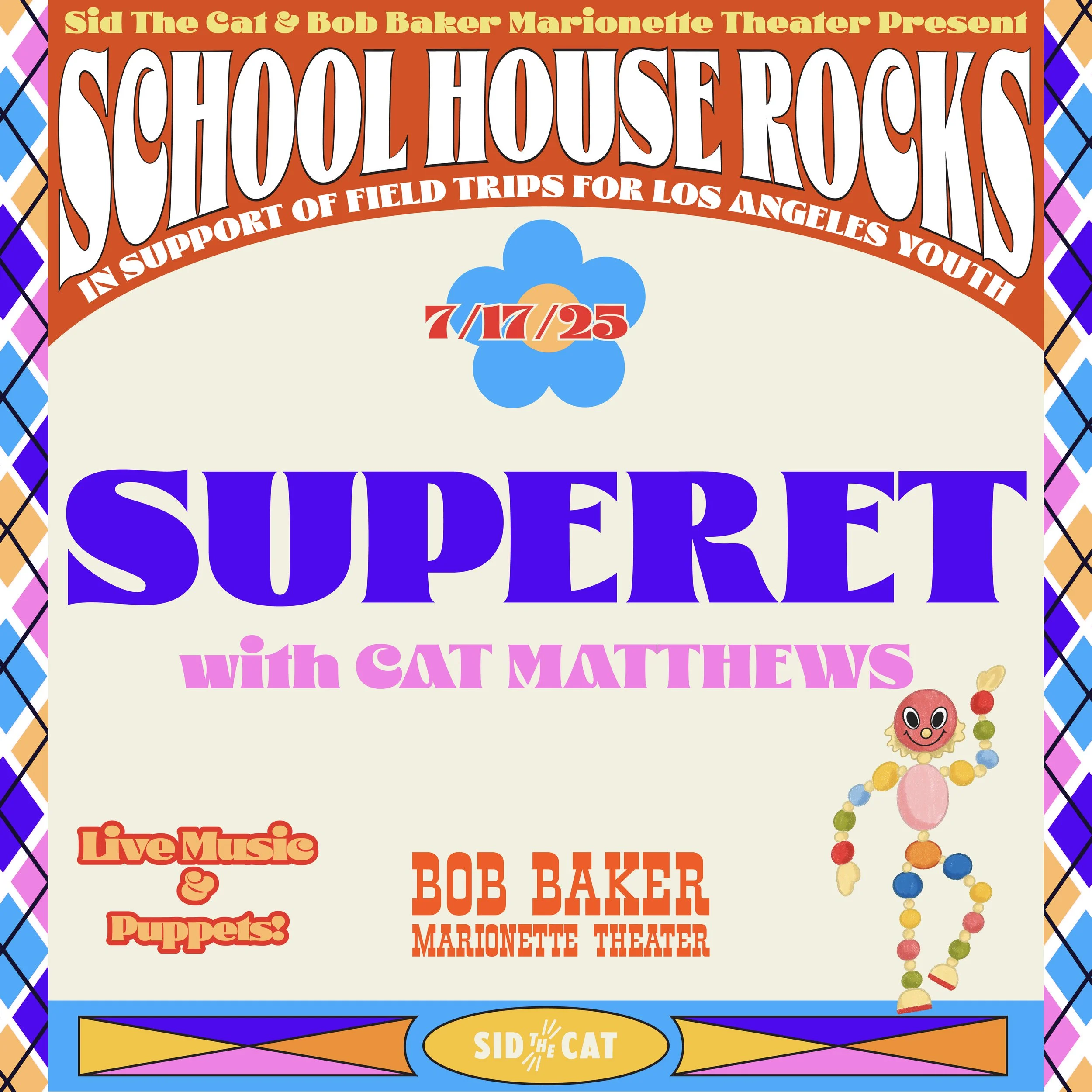 Joining forces with Sid the Cat, BBMT’s live concert series, School House Rocks, is pleased to present playful puppets on stage with special guests, Superet & Cat Matthews