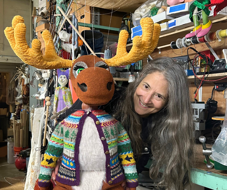 Lisa created an amazing sweater for one of our newest puppets, “Aunt Ler,” a knitting moose and train passenger in Choo Choo Revue! It was an exciting collaboration throughout Aunt Ler’s process with concept designs by Zane Yarbrough, early sculpts by Tony Candelaria, wood joinery by Diana Carver, and Lisa’s costuming creation.